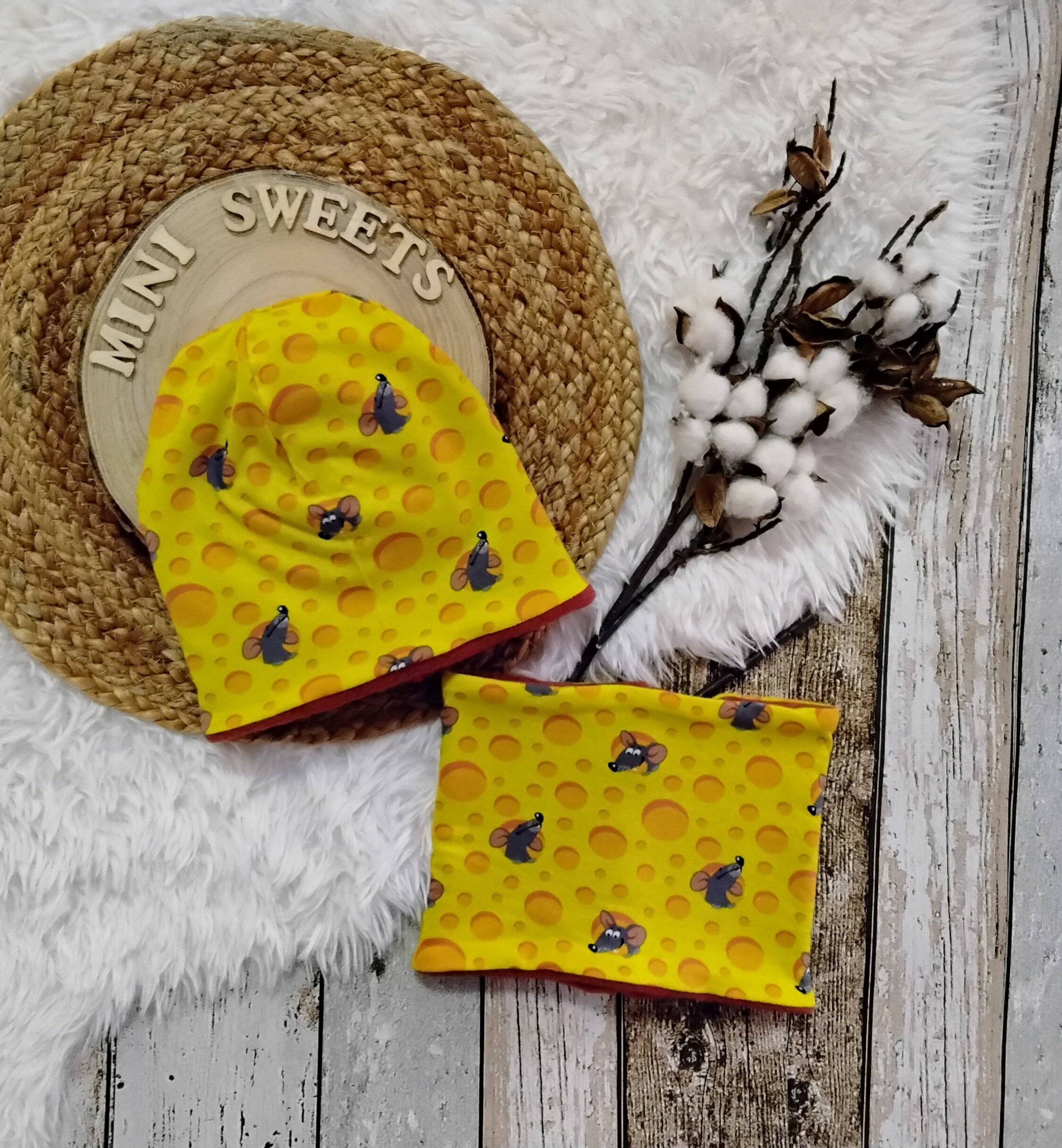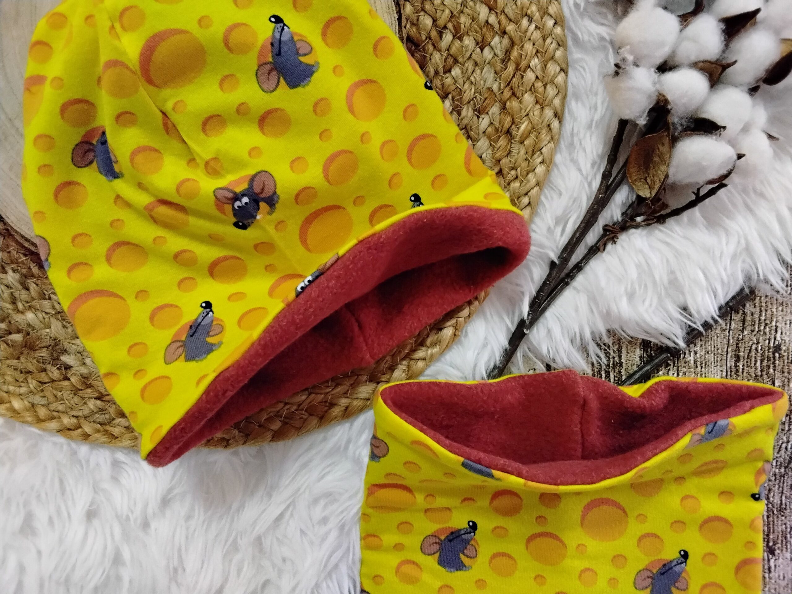 Schönes Set aus gefütterter Mütze und Loop aus Jerseystoff und weichem Fleece.