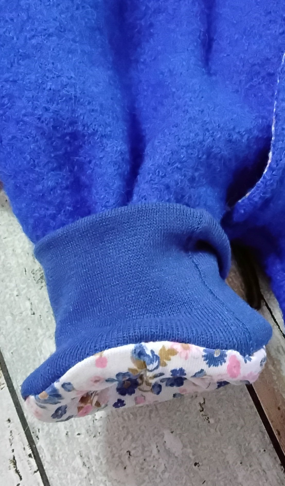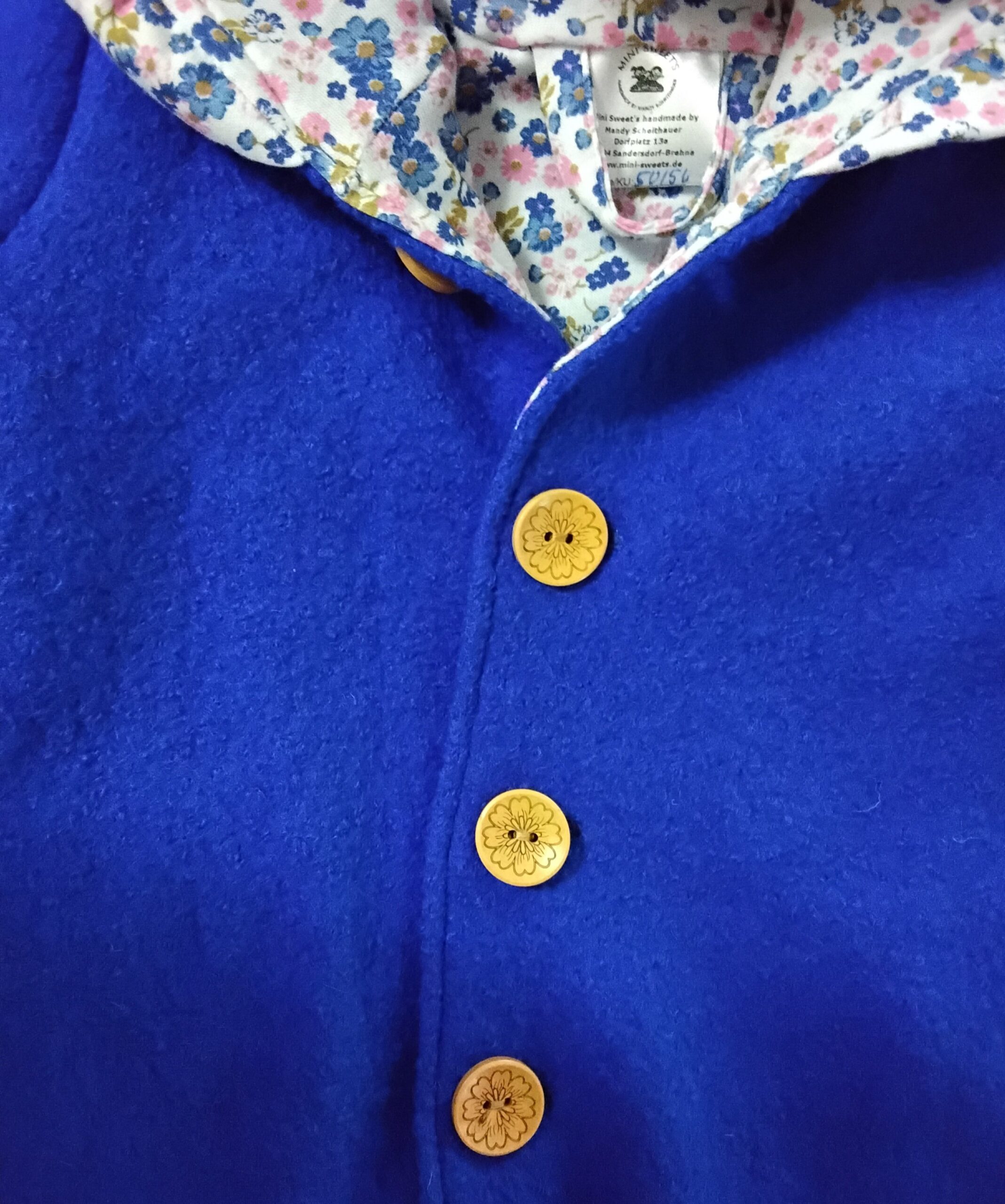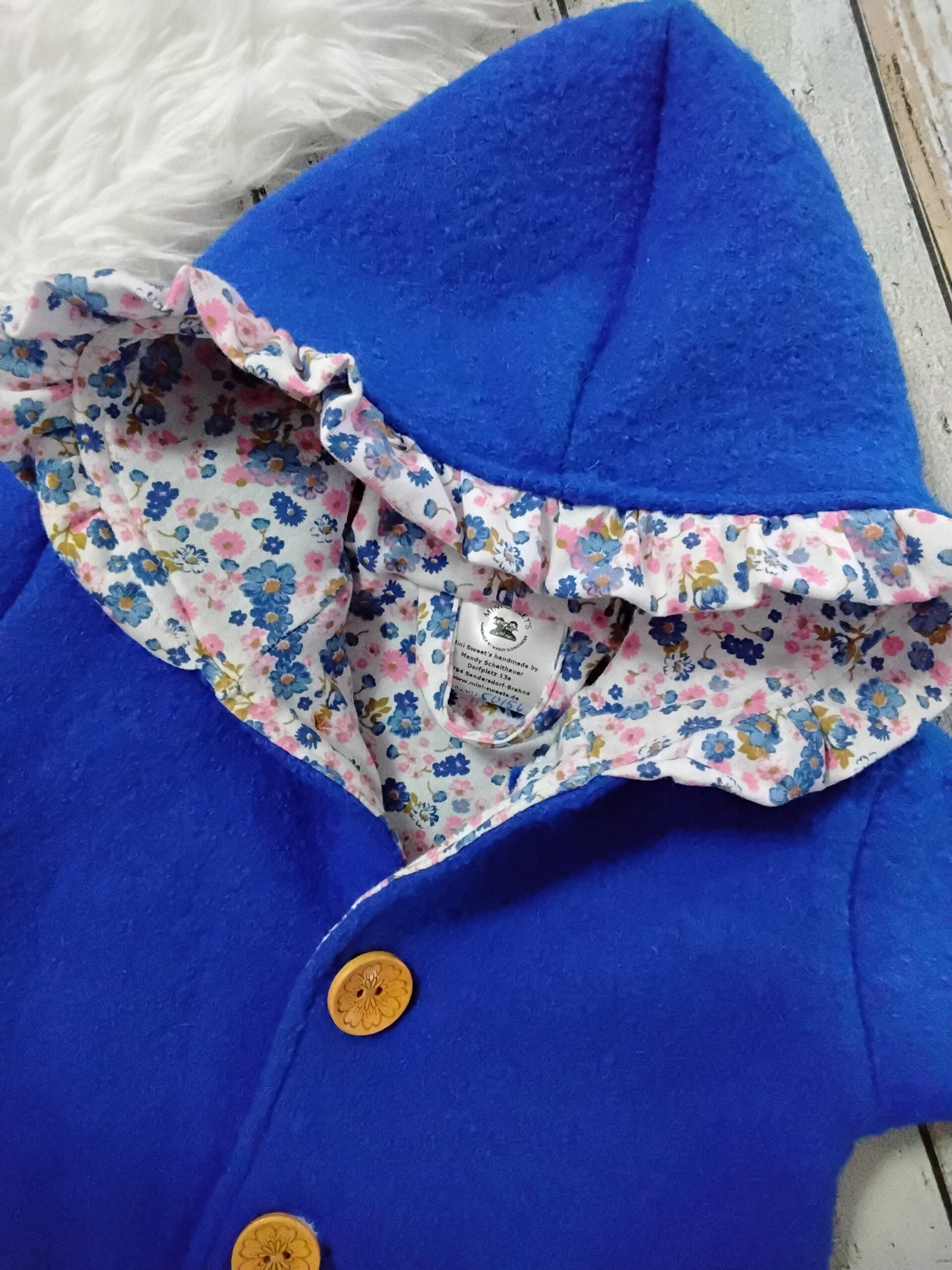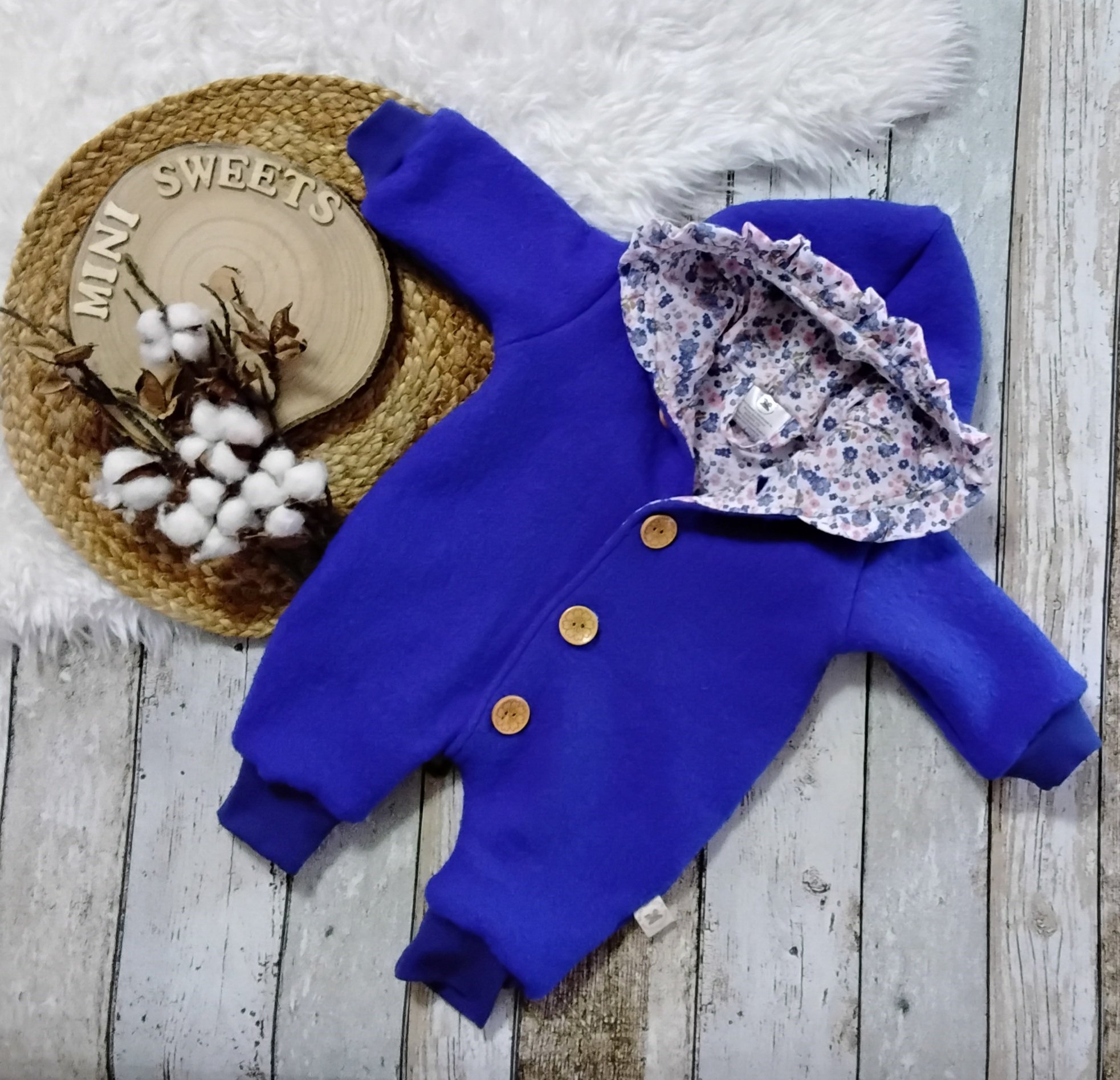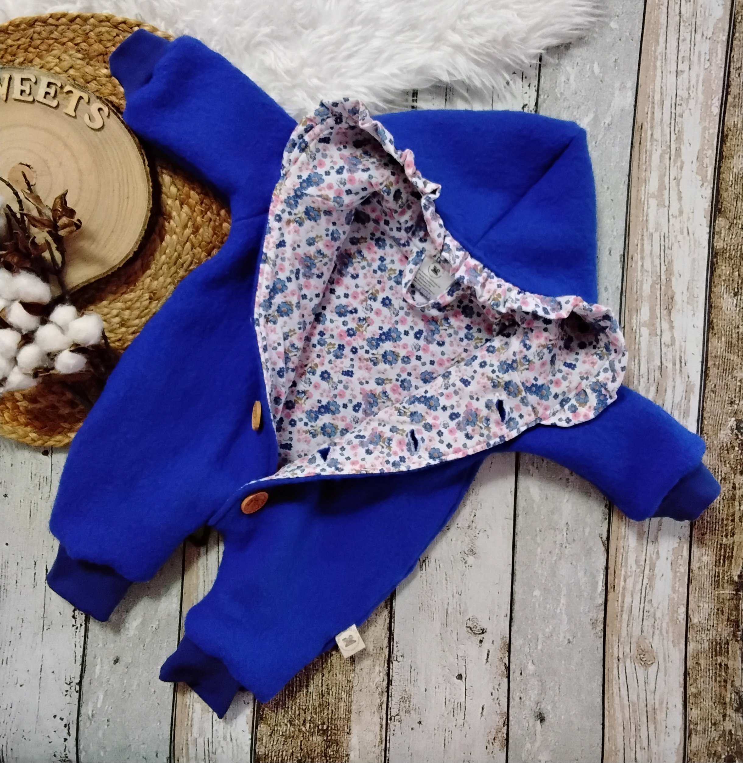 Komplett gefütterter Walkanzug mit Kapuze gr 56/56 aus Wollwalk (100% Schurwolle) und Jerseystoff (95% Baumwolle und 5 % Elasthan). Außerdem sind 5 echte Holzknöpfe mit einem Durchmesser von 2,5 cm angenäht. An Armen und und Beinen wurde ein farblich perfekt abgestimmtes Mitwachsbündchen gearbeitet. An der Kapuze befindet sich eine Rüsche aus dem Innenstoff.